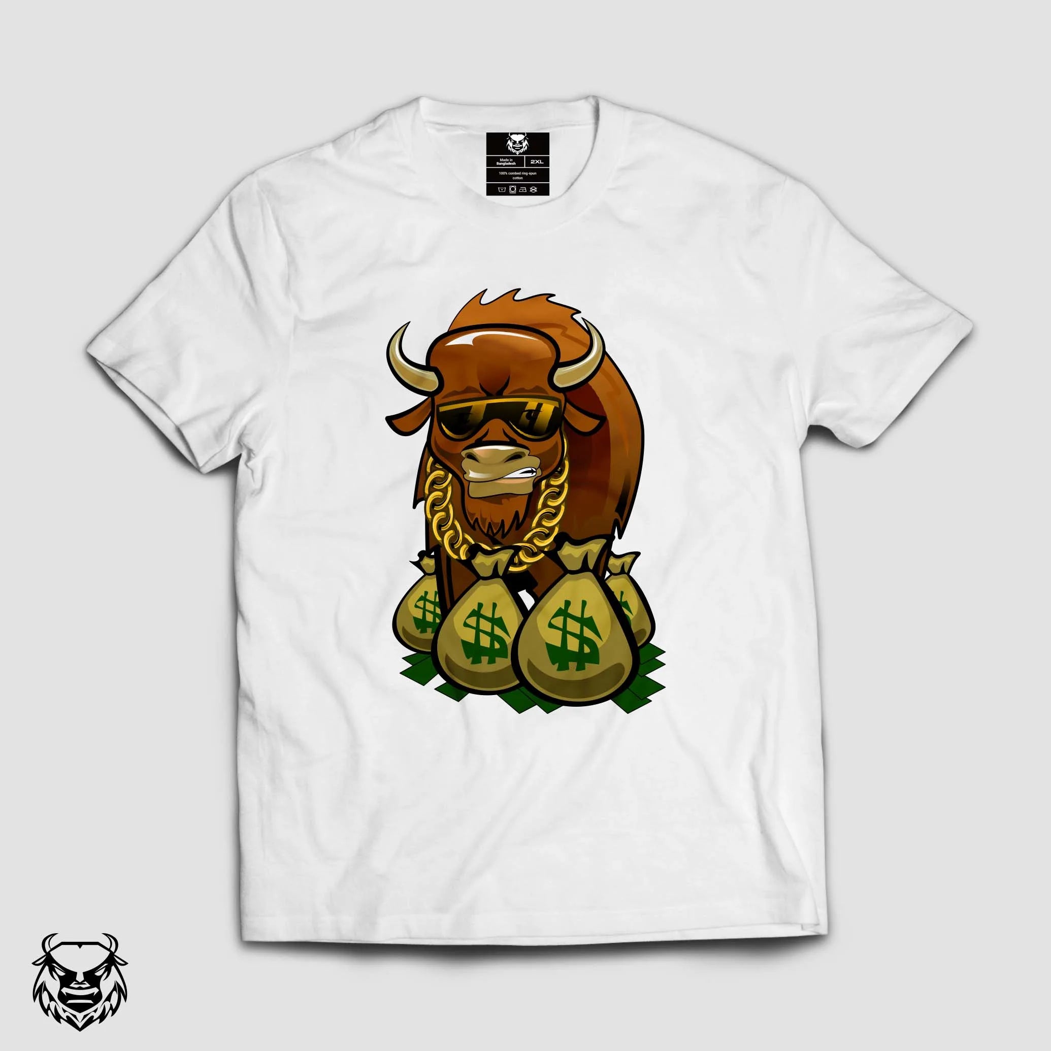 BLL “Wealthy Bison” Premium features a bold illustrated character symbolizing financial strength and fearless ambition. With its detailed cartoon-style artwork of a bison wearing luxury accessories and surrounded by money symbols, this tee represents success, hustle, and unapologetic confidence.